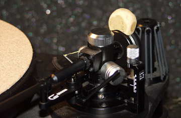 然后把抗滑力的装置解掉,即抗滑力为零。再把橡皮放在唱臂的重物上。见图17。如果唱头抬得高,就在橡皮另一端切掉一点,再放上试。一直到唱臂离开支撑架一点点为止。再把橡皮拿掉。装回抗滑力装置。把橡皮再放上,这时唱臂会向你的右边移动。如果向左边,或者不动的话,那是不正确的。只有缓慢地向右边移动才是正确的。向右边移动的速度太慢,或太快都是不对的。太慢就要加强抗滑力,太快的话就要减少抗滑力。按照我的经验,其速度大致比那种老式电钟的秒针快一点就可。调好后,可以用一张钢琴的唱片了放一下。特别是在钢琴大动态的部分。如果没有失真的话,抗滑力调试基本完成。