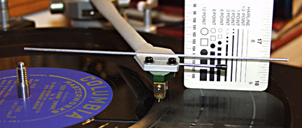 如果上述的方法没法做到的话,那只能用近似和机械的调整方法。先找一根直而轻的细杆子。我的是一根细的铝条,再把细铝条放置在唱臂头部的中心。用尺量出从唱盘到铝条的高度,然后再量另一边。调整方位角,一直到两边的高度相等。当然,这个不是理想的方法。对于一些喜欢完美的而且有些电子基础的朋友来讲,我来介绍一个非常好的方法。·
