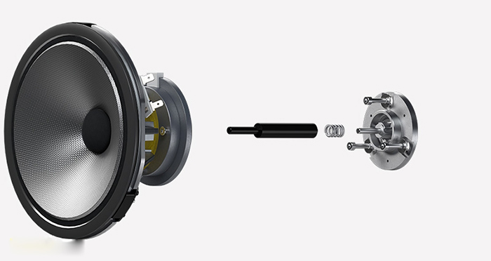碳环高音单元其关键是在无须减小高音扬声器振膜尺寸或添加辅助超高音单元的条件下,能够将高音单元的分裂振动频率推至更高,以确保人耳可闻的20kHz以下频带内获得理想的频率响应。在多个型号中702 S2落地箱和705 S2书架箱的高音继续使用了顶置式“鹦鹉螺”扬声器导管,高音单元安装于独立铝合金外壳中,能够避免传统音箱结构中常常出现的情形,即高音扬声器产生的声波不仅朝着听众方向传播,而且沿障板表面朝箱体边缘传播。它还能够使其在时间上得到精确调整,与中低音驱动单元保持一致,由此两个输出于声场形成完美的交叉音域。